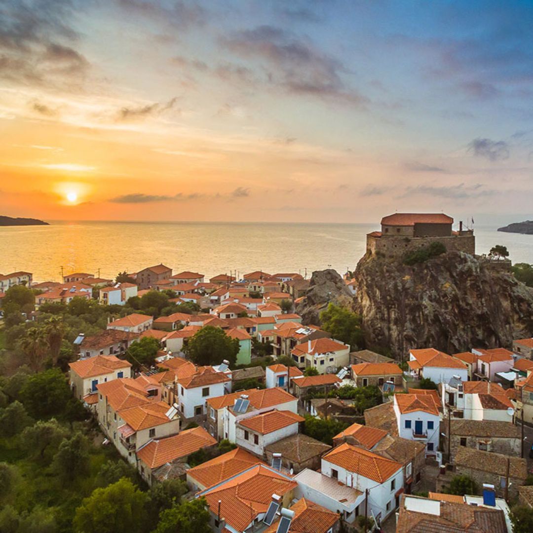 Petra, Midilli Adası’nın en çarpıcı kasabalarından biridir. Kırmızı kiremitli evleriyle denize nazır uzanan bu şirin köy, devasa bir kaya kütlesi üzerindeki Panagia Glykofilousa Kilisesi ile ünlüdür. 114 basamakla ulaşılan bu kutsal yapı, hem mimarisi hem de sunduğu manzara ile ziyaretçilerini büyüler. Gün doğumu ve batımında, kilise ve köy silueti eşsiz bir görsel şölen sunar. Petra, tarih, inanç ve doğanın uyum içinde buluştuğu özel bir duraktır.